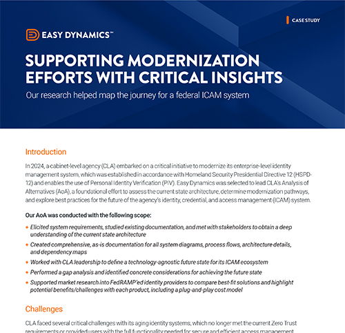 Publications capabilities statement Our Core Capabilities factsheet Identity, Credential, and Access Management factsheet Velum Cloud™ Delivery factsheet Managed Cybersecurity Services for Rural Broadband factsheet Accelerated Identity Market Research factsheet Credential Service Provider Selection factsheet Credential Service Provider Go-Live white paper OSCAL: The Future of Compliance Automation case study Supporting Modernization Efforts with Critical Insights case study Modernizing App Authentication success story Enterprise ICAM: Expanding MFA Adoption success story ICAM Program Management: Stakeholder Engagement success story Enabling Secure G2B Online Services success story Enterprise Workload Migration to AWS presentation An Overview of Our Company & Capabilities presentation Credential Service Provider Go-Live Overview presentation Identity Market Research Overview brochure Accelerate Your Career at Easy Dynamics